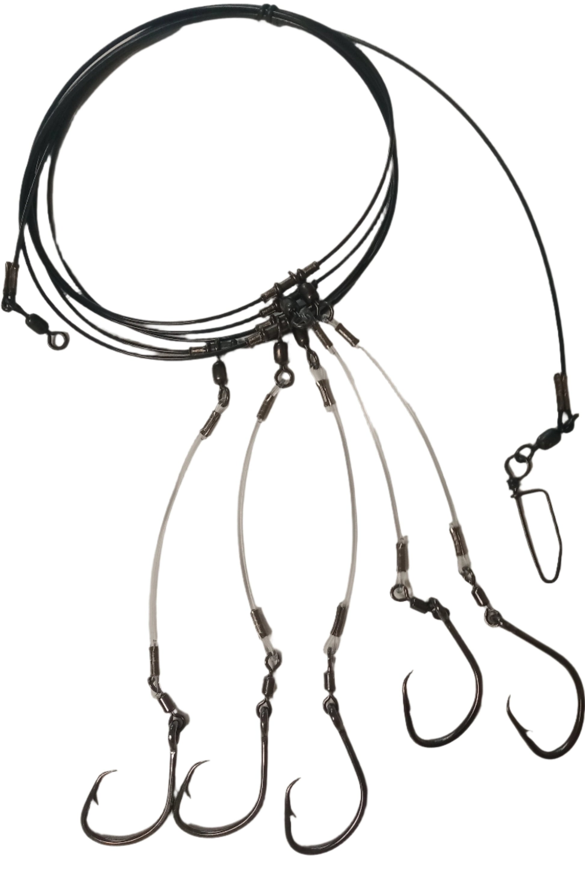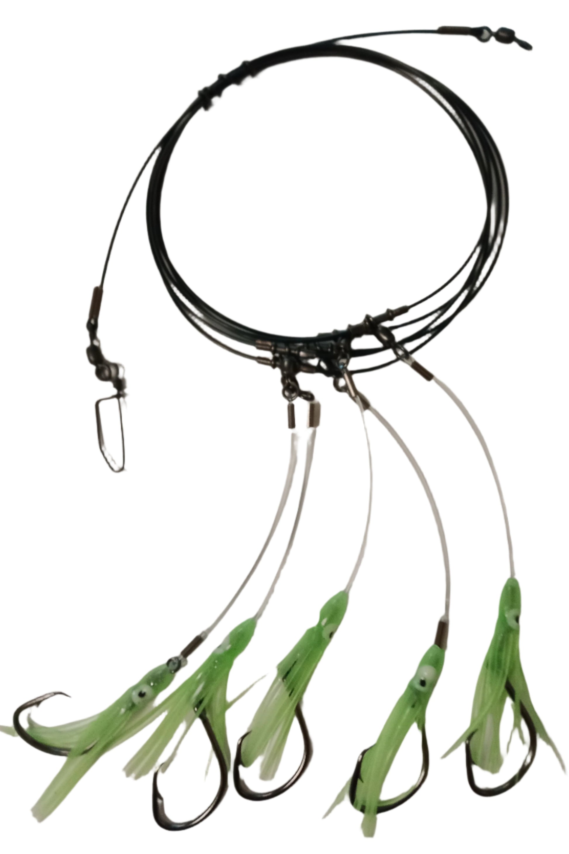 400lb. mainline and 200lb. leaders. Mainline manufactured with sleeve swivels making it easier to handle with less tangles. Extra strength hooks are manufactured with SPRO swivels aiding in fish spin off and twisted leaders. 7/0 or 5/0. Available with or without Glow Squid. 5 leaders per line.